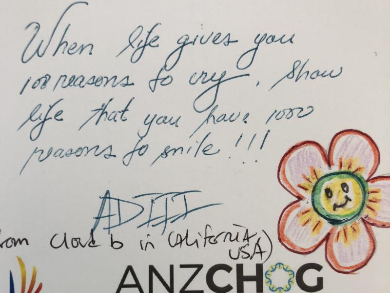 Below, you’ll see pictures of some of the beautiful notes that have been written by people of all ages from all around the world along with pictures of some of the strong, brave superheroes who have received Super Max the Turtles thanks to donations like yours.